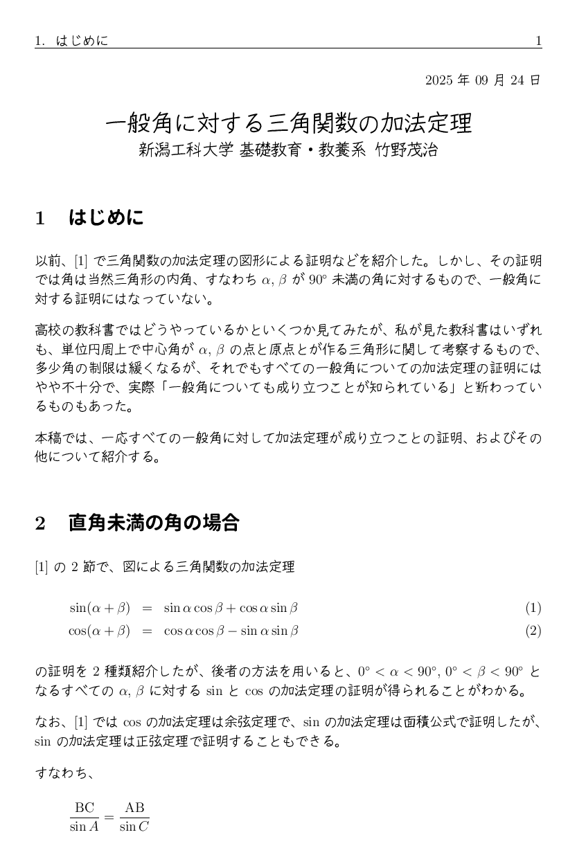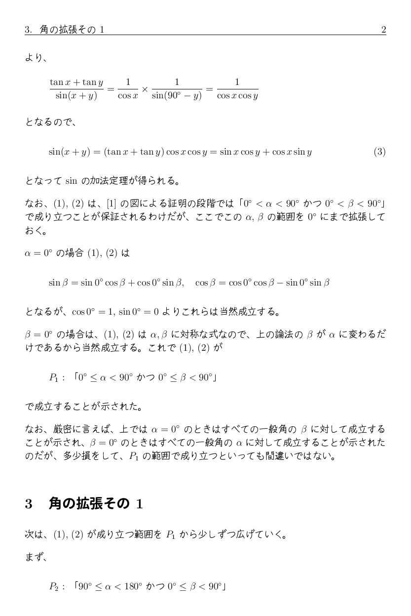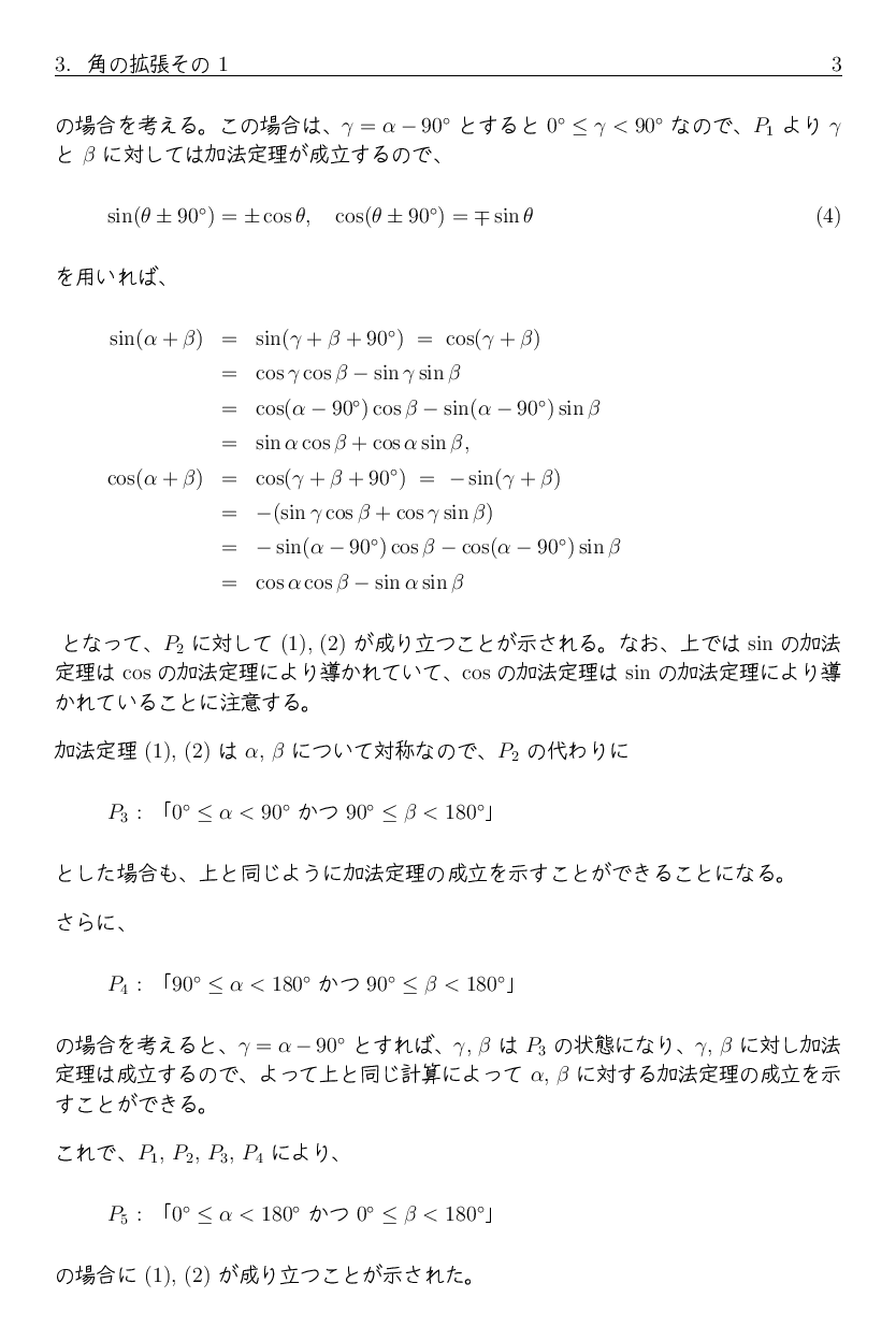 以前、「三角関数の加法定理について」 で三角関数の加法定理の図形による証明などを紹介しました。 しかし、その証明では角は当然三角形の内角、すなわち直角未満の角に対するもので、 一般角に対する証明にはなっていません。