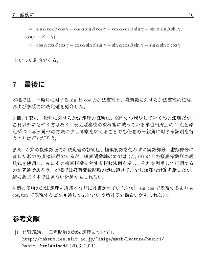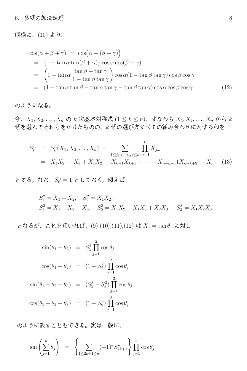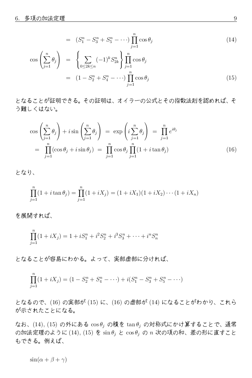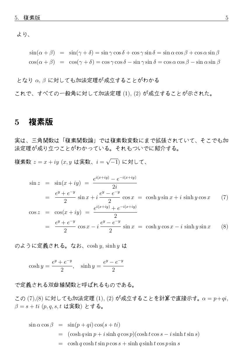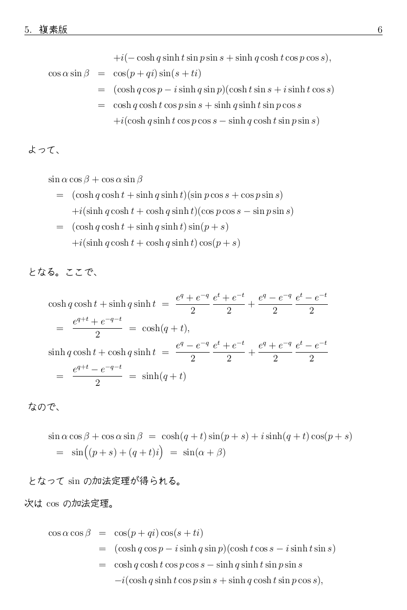 では、そこから sin(x+y+z) や cos(x+y+z) の加法定理はどんな形になるか 想像できるでしょうか。 実は sin(x+y+z) にはマイナスが出て来ますし、 cos(x+y+z) とある意味で非常に似たような式になります。 興味ある人は、自分で計算してみるといいでしょう。 ついでに sin(x+y+z+w)、cos(x+y+z+w) もやってみると、 何かの規則に気がつくかも知れません。
