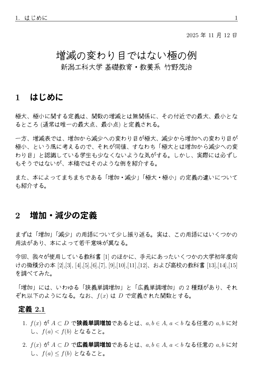 一方、増減表では、増加から減少への変わり目が極大、 減少から増加への変わり目が極小、という風に考えるので、 それが同値、すなわち「極大とは増加から減少への変わり目」と 認識している学生も少なくないような気がしますが、 実際には必ずしもそうではありません。 以下で、そのような例を紹介します。